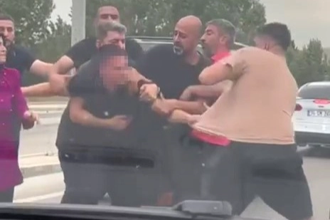 Kısa sürede büyüyen gerilim sonrası taraflar araçlarını durdurup yola indi. Anayol üzerinde başlayan kavgada yumruklar havada uçuştu.