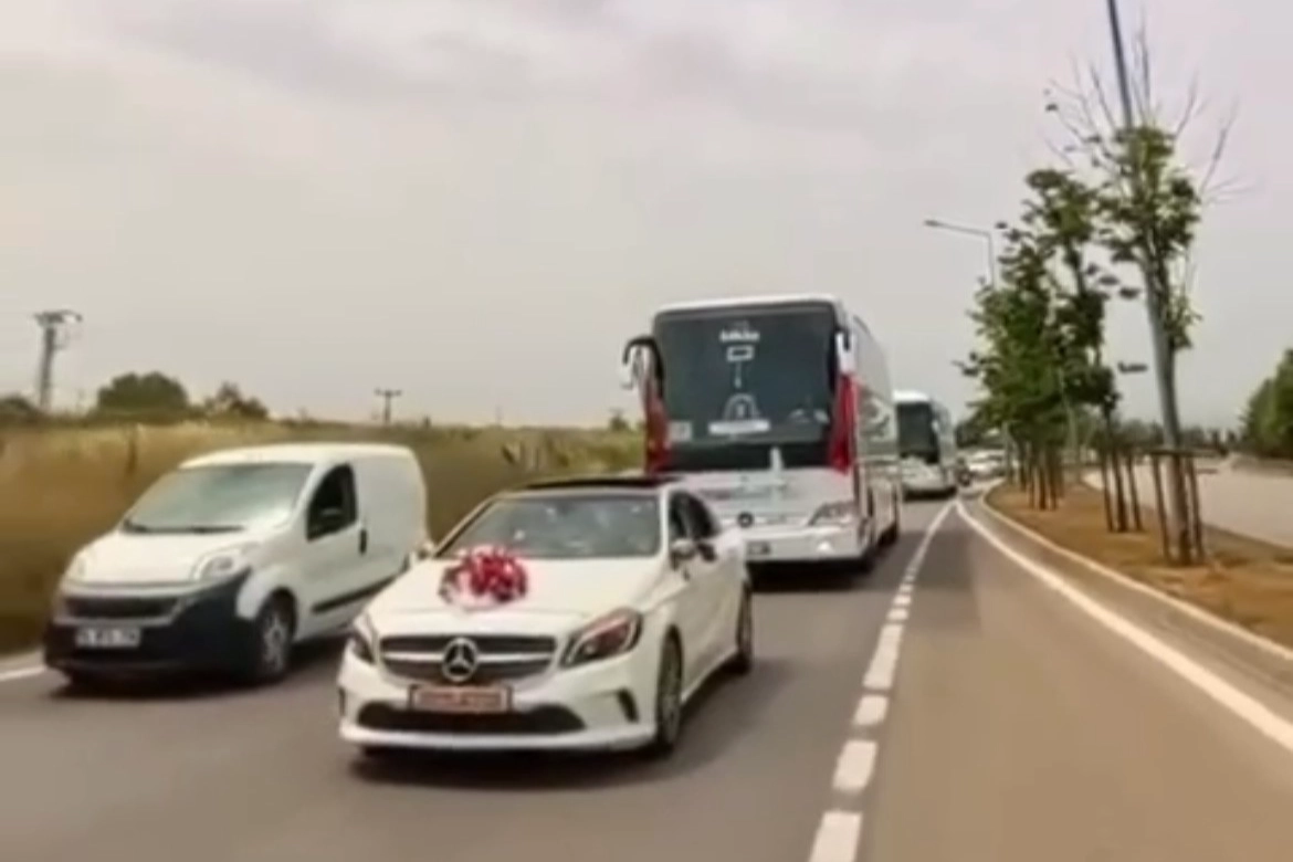 Düğün aracı gibi süslenen otobüsle yapılan şehir turu ilginç anlara sahne olurken, konvoydaki bazı otomobil sürücülerinin trafiği tehlikeye düşüren hareketleri tepkilere neden oldu.