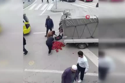 Durumu gören çevredeki yardımsever vatandaşlar, domatesleri el birliğiyle toplayarak satıcıya yardım etti.