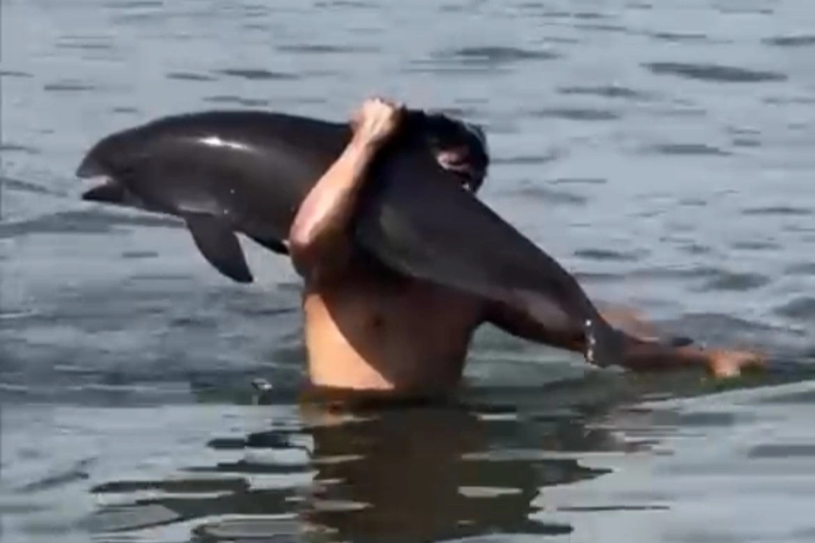 Yunusu omzuna alan kişi, kıyıya kadar yürüdü. Omzundaki yunusu kıyıya bırakan kişi, yüzmeye devam etti.