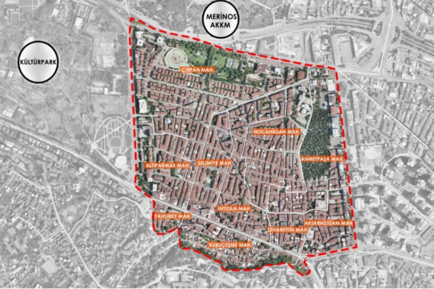 82 hektar büyüklüğündeki proje alanı, Osmangazi İlçesi sınırları içerisinde güneyde Altıparmak Caddesinin her iki yakası, batıda Stadyum Caddesi, kuzeyde Kıbrıs Şehitleri Caddesi ve doğuda Fevzi Çakmak caddesi ile sınırlandırılan, Altıparmak, Çırpan, Selimiye, İntizam, Hocahasan, Ahmetpaşa, Şehabettinpaşa, Aktarhüssam, Kuruçeşme ve Yahşibey mahallelerinin bir kısmını kapsıyor.