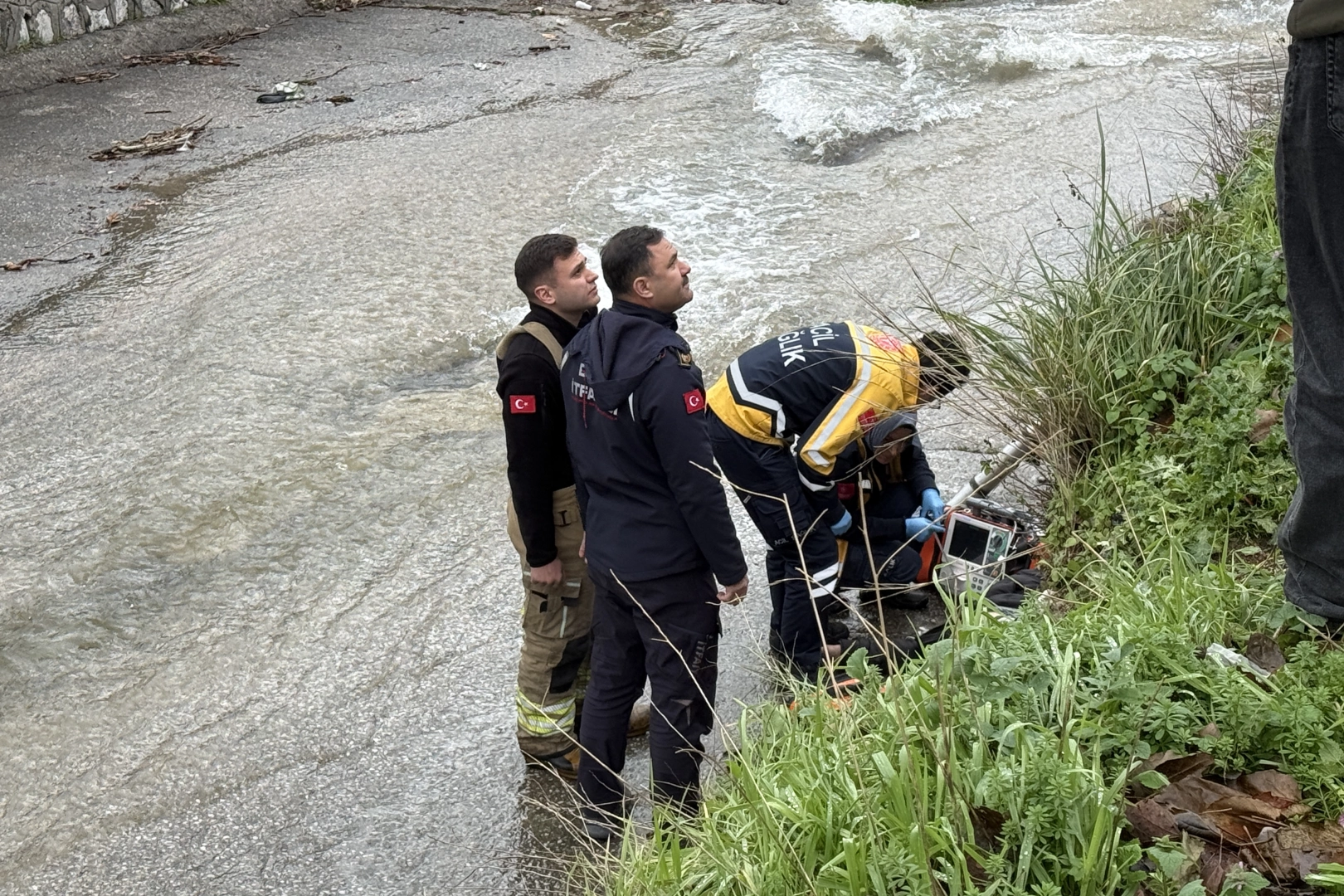 İtfaiye merdiveniyle dere yatağına giren ekipler, bu kişinin hayatını kaybettiğini belirledi.