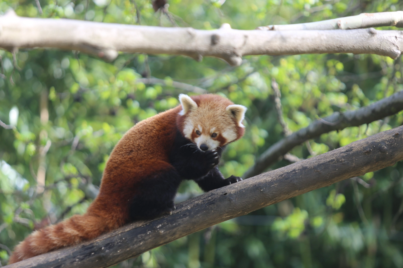 Bursa Büyükşehir Belediyesi Hayvanat Bahçesi'nde kızıl pandalar, bakıcılarının kova ile çıkardığı sesle harekete geçmeye başladı. Hızla yemeklerini almak için bir panda koşarken, diğer yandan güneşli havanın keyfini çıkaran panda ise dinlenmeye çekildi.