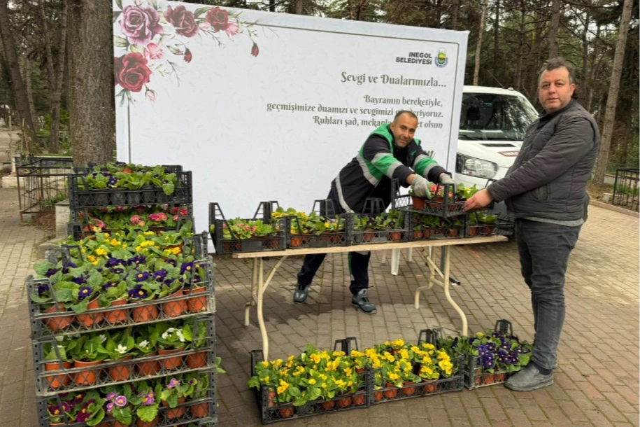 İnegöl Belediyesi Park Bahçeler Müdürlüğü ile Defin Hizmetleri Müdürlüğü’nün ortak çalışması kapsamında; İstanbullu Hasan, Kavaklaraltı, Hastane, Orhaniye, Mahmudiye 1 ve 2 ile Hamzabeyli Sadık Ağa Kent Mezarlığı’nda toplam 9 bin çiçek dağıtıldı. Mezarlıkları ziyaret eden vatandaşlar, aldıkları çiçekleri yakınlarının kabirlerine dikti. Mezarlıklar rengarenk çiçeklerle donatılırken, ziyaretlerde duygusal anlar yaşandı.
