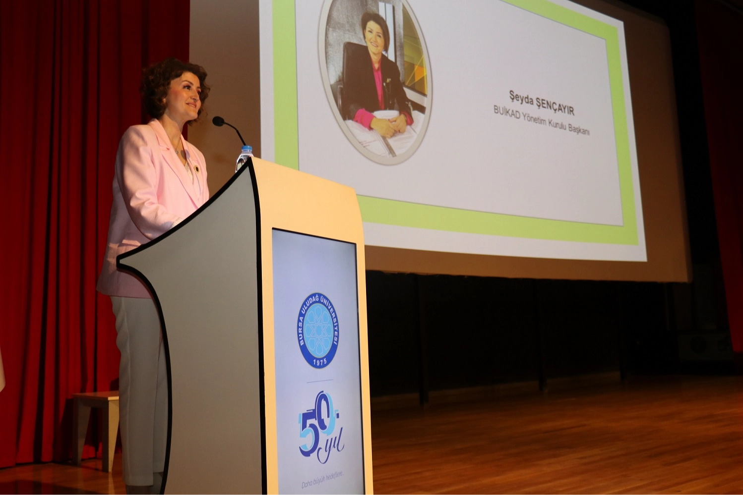BUÜ Mete Cengiz Konferans Salonu'nda gerçekleşen etkinliğin açılışında konuşan BUİKAD Başkanı Şeyda Şençayır, '' Bugün sadece 17. dönemin sertifika töreni için değil, bir değişimin, bir inancın ve yıllara yayılan bir emeğin kutlaması için buradayız. Siz gençlerle 17 yıl önce çıktığımız bu yolculukta, o günden bugüne hiç ara vermeden, kararlılıkla yolumuza devam ettik. Çünkü biliyoruz ki bir genç kızın içindeki potansiyeli farketmesi yalnızca onun değil, toplumunda geleceğini dönüştürüyor. Biraz sonra vereceğimiz sertifikalar sadece başarıyı değil, cesaretinizi de simgeliyor. Bizler BUİKAD ailesi olarak siz genç kızlarımızın güçlenmesini bir gelecek vizyonu olarak görüyoruz. Çünkü biliyoruz ki kadınlar birbirine el verdikçe dönüşüm durdurulamaz.'' şeklinde konuştu. Şençayır, ''Bu projenin amacı gücünüzü farketmeniz, potansiyelinizi açığa çıkarmanız ve özgüvenle geleceğe adım atmanıza destek olmaktır. Sizlere hayallerinizin peşinden gitmenizi, korkmadan cesaretle ilerlemenizi ve birbirinize her zaman destek olmanızı tavsiye ediyorum. Sevgili gençler! Bu projenin bir parçası olduğunuz için çok mutlu olduğumuzu ifade etmek isterim. Yolunuz açık gücünüz daim olsun. Bu anlamlı projeye katkı koyan paydaşlarımız; Bursa Uludağ Üniversitesi, Bursa Teknik Üniversitesi ve Mudanya Üniversitesi'nin rektörleri başta olmak üzere, tüm kıymetli hocalarımıza, noktalama projemizin lideri, BUİKAD geçmiş dönem başkanlarından Sn. Özlem Baş Bayraktar ve Noktalama Komitesi Başkanı Sayın Tülin Geçer başta olmak üzere tüm komite üyelerine, gönüllü koçlarımıza, öğrencilerimize değerli desteklerini sunan kurumsal üyelerimiz BORÇELİK, İNOKSAN, SEGER ve YEŞİLOVA Holding'e, kapanış toplantımızın sunumunu başarıyla gerçekleştiren Noktalama Komitesi Üyesi Sayın Zeynep Biçer Özçelik'e, kapanış toplantımızda tecrübelerini paylaşarak yanımızda olan onur konuğumuz, konuşmacı, Yazar Sayın Hakan Akdoğan'a sonsuz teşekkür ederiz. Sözlerimi ulu önderimiz Mustafa Kemal Atatürk'ün sözleriyle bitirmek istiyorum; 'Gençler! Cesaretimizi pekiştiren ve sürdüren sizlersiniz. Siz almakta olduğunuz terbiye ve irfan ile insanlık değerinin, vatan sevgisinin, fikir hürriyetinin en kıymetli timsali olacaksınız.' Bizler de buna yürekten inanıyoruz. Sevgi ve saygılarımla, hayatın gülümseyen yüzüne her daim birlikte bakabilmemiz dileklerimle...'' diyerek konuşmasını noktaladı.