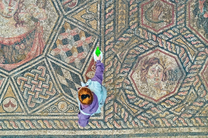 Merkezdeki bölümün etrafındaki saç örgüsü motiflerinin her rengin 3-4 farklı tonu kullanılarak yapıldığını, geometrik ve üç boyutlu motiflerle bezendiğini, labirent, gordion düğümü gibi motifler yapıldığını anlatan Kahveci, "Mozaikte 'tessera' dediğimiz yapı taşları, taş, mermer ve camdan temin ediliyor. Dış hatlarda bir, merkez tasvirlerde yarım santimetreküp. Oldukça detaylı bir çalışma yapılmış." dedi.