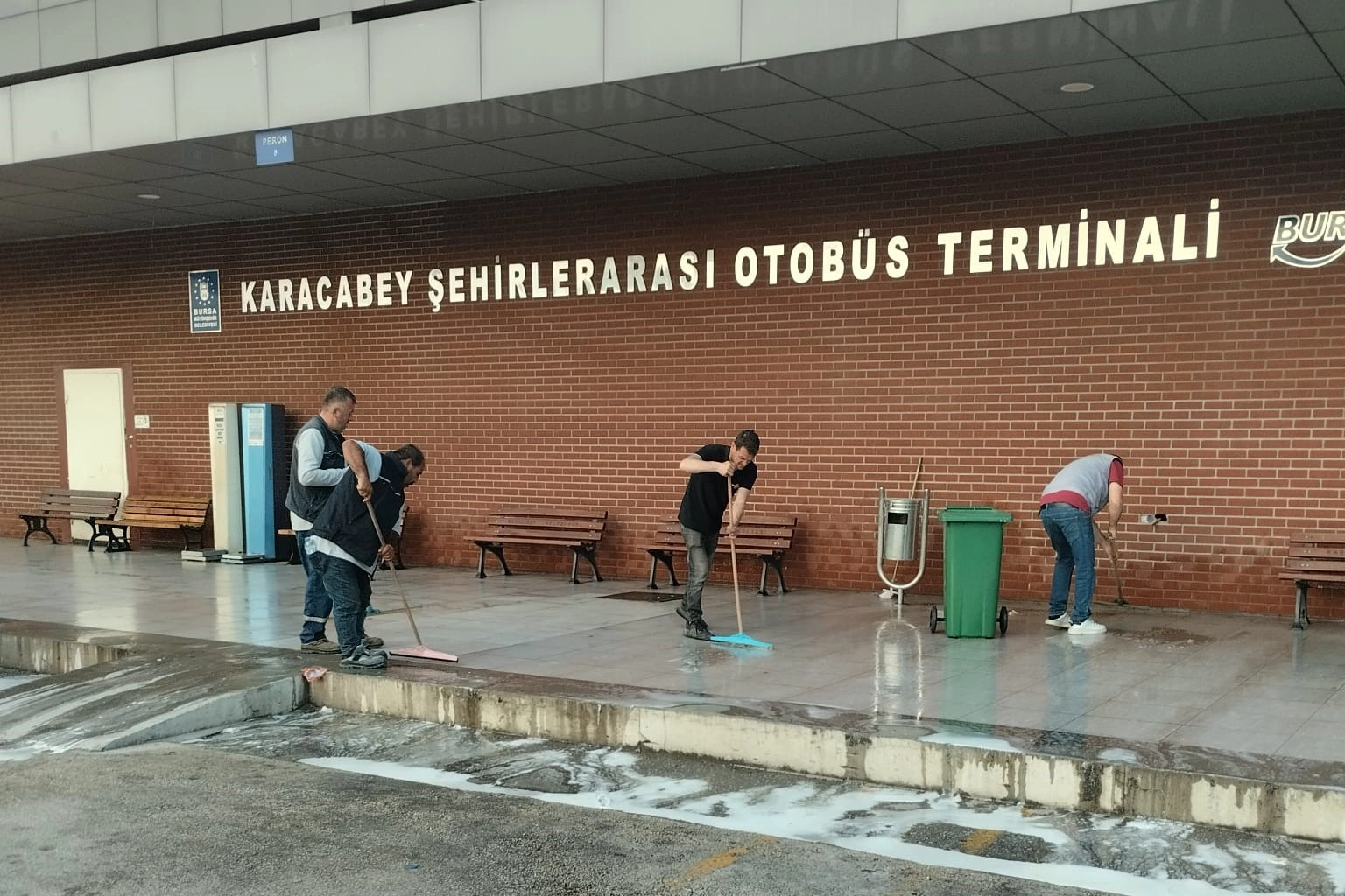 Temizlik çalışmaları kapsamında terminaldeki kirli ve kötü kokulara neden olabilecek alanlar dezenfekte edildi; zemindeki lekeler, toz ve atıklar basınçlı suyla temizlendi. Ayrıca, çevredeki çöp kutuları ve bekleme alanları da hijyenik hale getirildi.