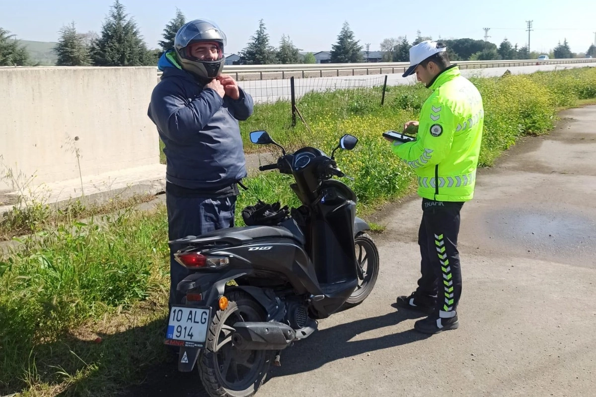 Karacabey Bölge Trafik Denetleme İstasyon Amirliği Ekipleri, Bursa-İzmir kara yolundaki denetimlerde 32 motosikletliyi durdurdu.