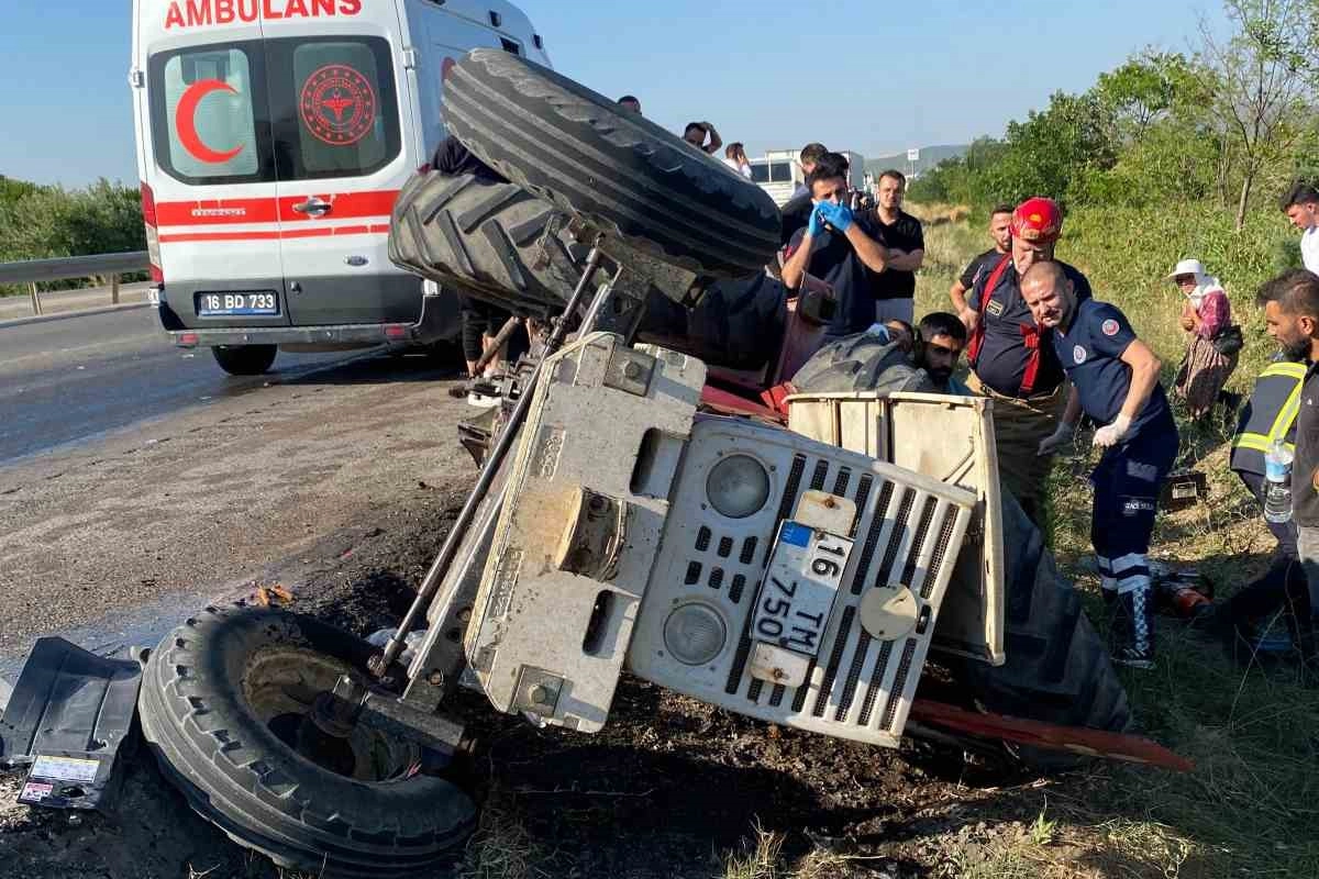 Edinilen bilgiye göre, saat 17.45 sıralarında Harmanlı Mahallesi yakınlarında, Balıkesir istikametinden Bursa yönüne seyir halinde olan Mehmet Emin A.’nın kullandığı 33 AZT 075 plakalı çekici, Hüseyin Ş. (64) yönetimindeki 16 TM 750 plakalı traktöre çarptı. Çarpışmanın etkisiyle devrilen traktörün sürücüsü yaralandı. Yaralı, ambulansla Karacabey Devlet Hastanesi’ne kaldırılarak tedavi altına alındı.