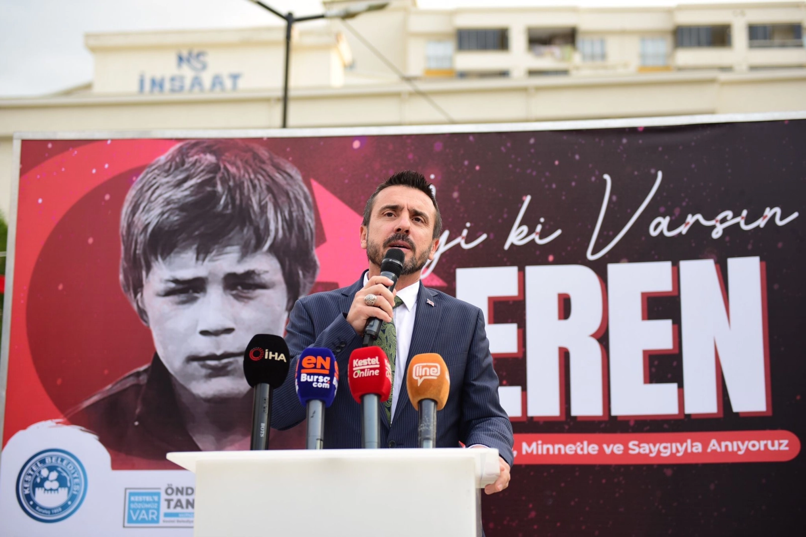 Şehit Eren Bülbül Parkı’nın açılışında konuşan Kestel Belediye Başkanı Önder Tanır, "Bugün açılışını yapmak için bir araya geldiğimiz parkımıza kahraman şehidimiz Eren Bülbül evladımızın ismini verdik. Şehidimizin ismi kıyamete kadar yaşayacak. Böylesine güzel bir duyguya vesile olabildiysek ne mutlu bizlere. Belediye meclisimizde aldığımız karar ile parkımızın ismini Eren Bülbül olarak tescilledik. Tüm meclis üyesi arkadaşlarımıza ayrı ayrı teşekkürlerimi sunuyorum. Tüm partilerimizin katkısıyla bu ismi yaşatıyoruz. Bu bize mahallemize kazandırmış olduğumuz bir parktan çok daha öte gönül rahatlığı veriyor. Bu parka gelen, bu parkın önünden geçen herkes duvarda yazan ‘İyi ki varsın Eren’ yazısını görecek ve şehidimizi dualarla anacak. Şehidimize bir kez daha Allah’tan rahmet diliyorum" dedi.