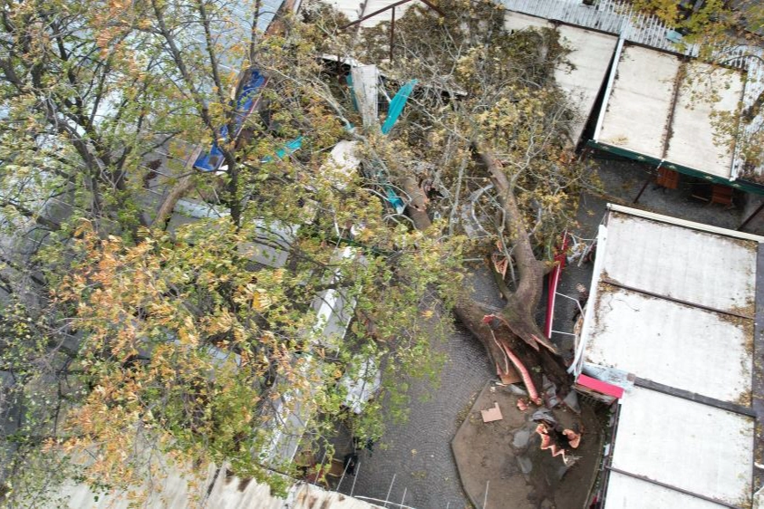 2014 yılında tescillenen ve o zaman 241 yaşında olduğu kayıtlara geçen tarihi çınarın devrilmiş hali dron ile havadan görüntülendi.