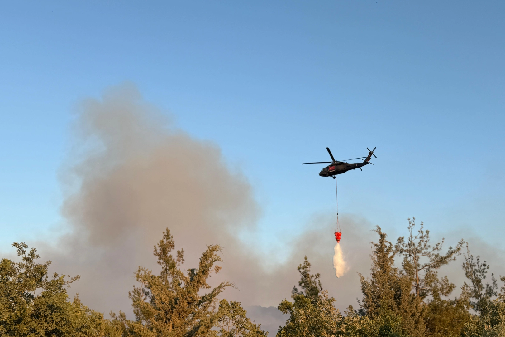 HELİKOPTER TELLERİN ALTINDAN GEÇİP YANGINA MÜDAHALEYE DEVAM ETTİ