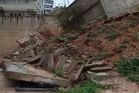 Güzelyalı Mahallesi'nde ise bir sitenin istinat duvarı çöktü. Yerle bir olan istinat duvarının altında kimsenin olmaması facianın önüne geçti.
