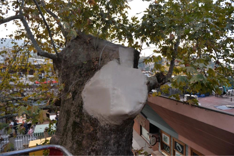 Park ve Bahçeler Dairesi Başkanlığı ekipleri tarafından yapılan incelemede, anıt ağacın açık yarasında çürümüş ve mantarlaşmış bölümler tespit edildi. Hızlı bir şekilde bakım ve restorasyon işlemlerine başlayan ekipler, özel ilaçlarla ‘çürümeye yol açan’ bakterileri temizledi. Ağacın iskeletine teller aracılığıyla destek uygulanırken, son aşamada özel yalıtım malzemesi kullanılarak ağacın açık yarası kapatıldı. Tedavi gören kısım boyanarak çınar ağacının formu yeniden düzenlendi.