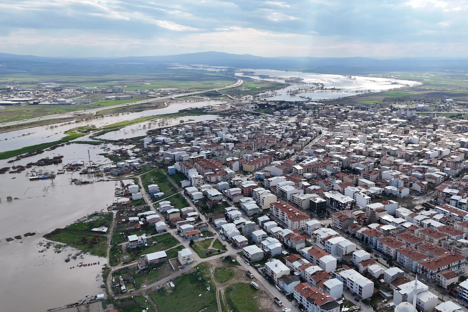 Karacabey ilçesi Bayıraltı Mahallesinde tarım arazileri adeta göle döndü. Dron ile havadan görüntülenen manzarada, geniş ekili alanların tamamen suyla kaplandığı, bazı bölgelerde ise su seviyesinin yol kenarlarına kadar ulaştığı görüldü.
