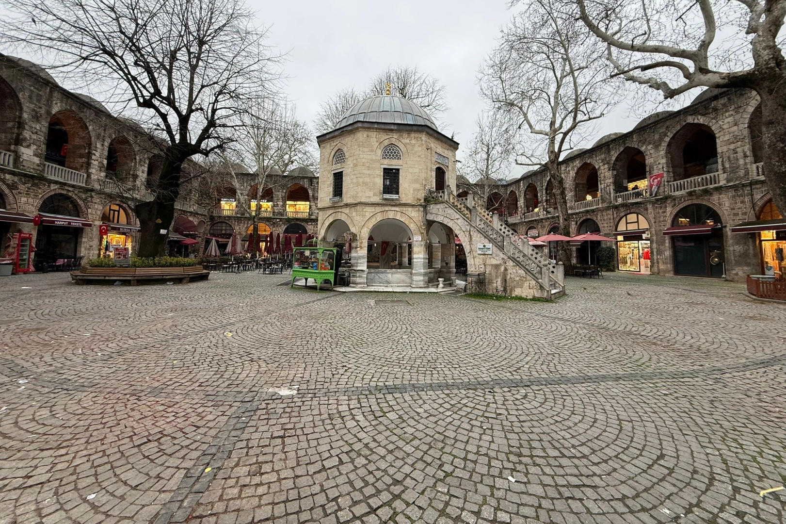 Bursa Vakıflar Bölge Müdürlüğü’nün aldığı karar kapsamında Koza Han’ın avlusunda faaliyet gösteren kafelere ait masa, sandalye ve şemsiyelerin kaldırılmasına yönelik verilen süre bugün itibarıyla sona erdi.