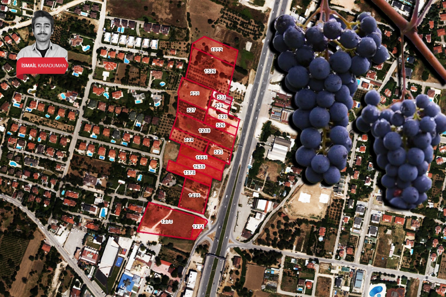 Tapu ve Kadastro Genel Müdürlüğü (TKGM) Parsel Sorgulama Uygulaması kayıtlarında; 523 sayılı parselin 1875 metrekarelik tarla, 524 sayılı parselin 2.550 metrekarelik bağ, 526 sayılı parselin 1.400 metrekarelik bağ, 527 sayılı parselin 1.850 metrekarelik bağ, 528 sayılı parselin 1.525 metrekarelik tarla, 529 sayılı 1058 metrekarelik parselin arsa, 530 sayılı 3.600 metrekarelik parselin tarla, 531 sayılı 804 metrekarelik parselin 3 katlı bina, 1219 sayılı 5030 metrekarelik parselin tarla, 1270 sayılı 7.229 metrekarelik parselin arsa, 1271 sayılı 956 metrekarelik parselin arsa, 145 sayılı 3.979 metrekarelik parselin arsa, 1526 sayılı 7.216 metrekarelik parselin arsa, 1578 sayılı 2.297 metrekarelik parselin arsa, 1659 sayılı 2.298 metrekarelik parselin arsa, 1665 sayılı 2.298 metrelik parselin arsa ve 1832 sayılı 3.290 metrekarelik parselin arsa olarak yer aldığı görüldü.