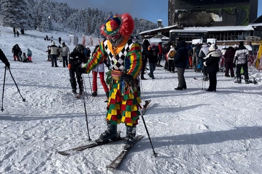 Bursa’da profesyonel animatörlük yapan Mücahit Değirmenci, farkındalık yaratmak ve tatilcilere moral vermek amacıyla palyaço kostümünü giyip, kayak takımlarını kuşandı.
