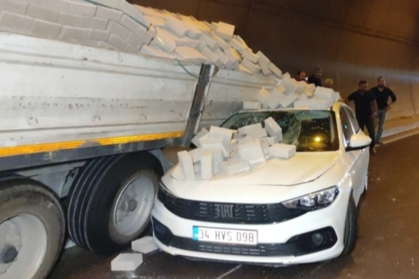 Hareket eden tır daha sonra A.E. (43) idaresindeki 34 HVS 098 plakalı otomobile çarparak otomobili dorsesinin altına sıkıştırdı. Dorsedeki parke taşlar, sıkışan otomobilin üzerine döküldü.