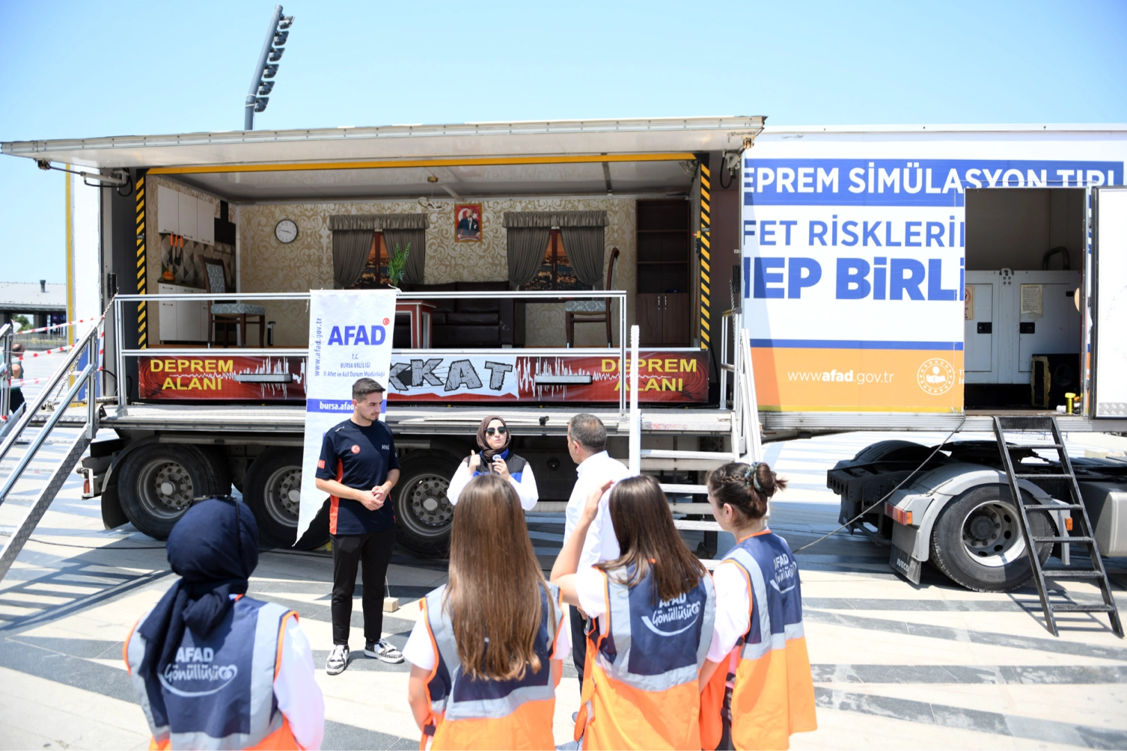 Deprem bilinci ve deprem farkındalığı oluşturmak amacıyla Bursa’yı ilçe ilçe gezen Bursa İl Afet ve Acil Durum (AFAD) Müdürlüğü’nün deprem simülasyon TIR’ı, Osmangazi Belediyesi ev sahipliğinde vatandaşlarla buluştu.