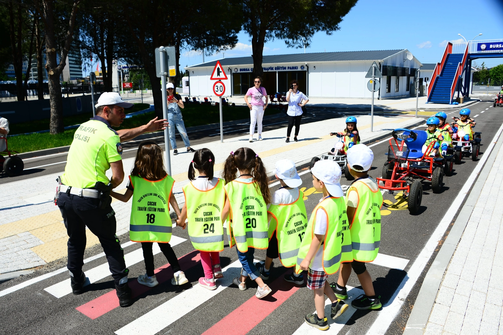 "Çocuk Trafik Eğitim Parkları Projesi" kapsamında İçişleri Bakanlığı ve Bursa Büyükşehir Belediyesince trafik kurallarını iyi bilen, donanımlı nesillerin yetişmesine katkıda bulunmak amacıyla yapılan bisiklet ve yürüyüş yolunun yer aldığı projede öğrenciler bilgilendirmeye devam ediliyor.