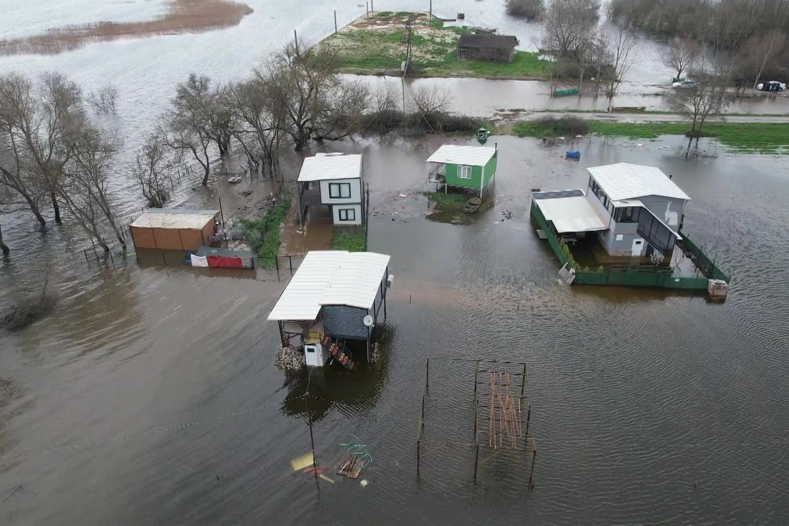 Bölgede oluşan taşkın dron ile havadan görüntülenirken, ortaya çıkan manzara gölün ne denli geniş bir alana yayıldığını gözler önüne serdi.