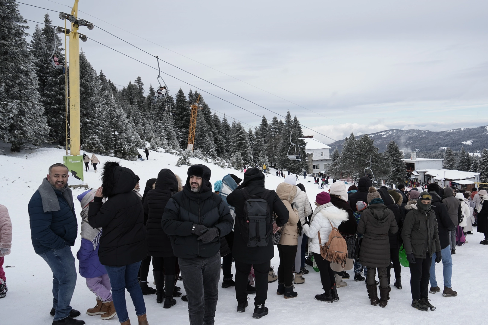 Hafta sonunu fırsat bilen yerli ve yabancı turistler kayak pistlerine akın edince metrelerce kuyruk oluştu.