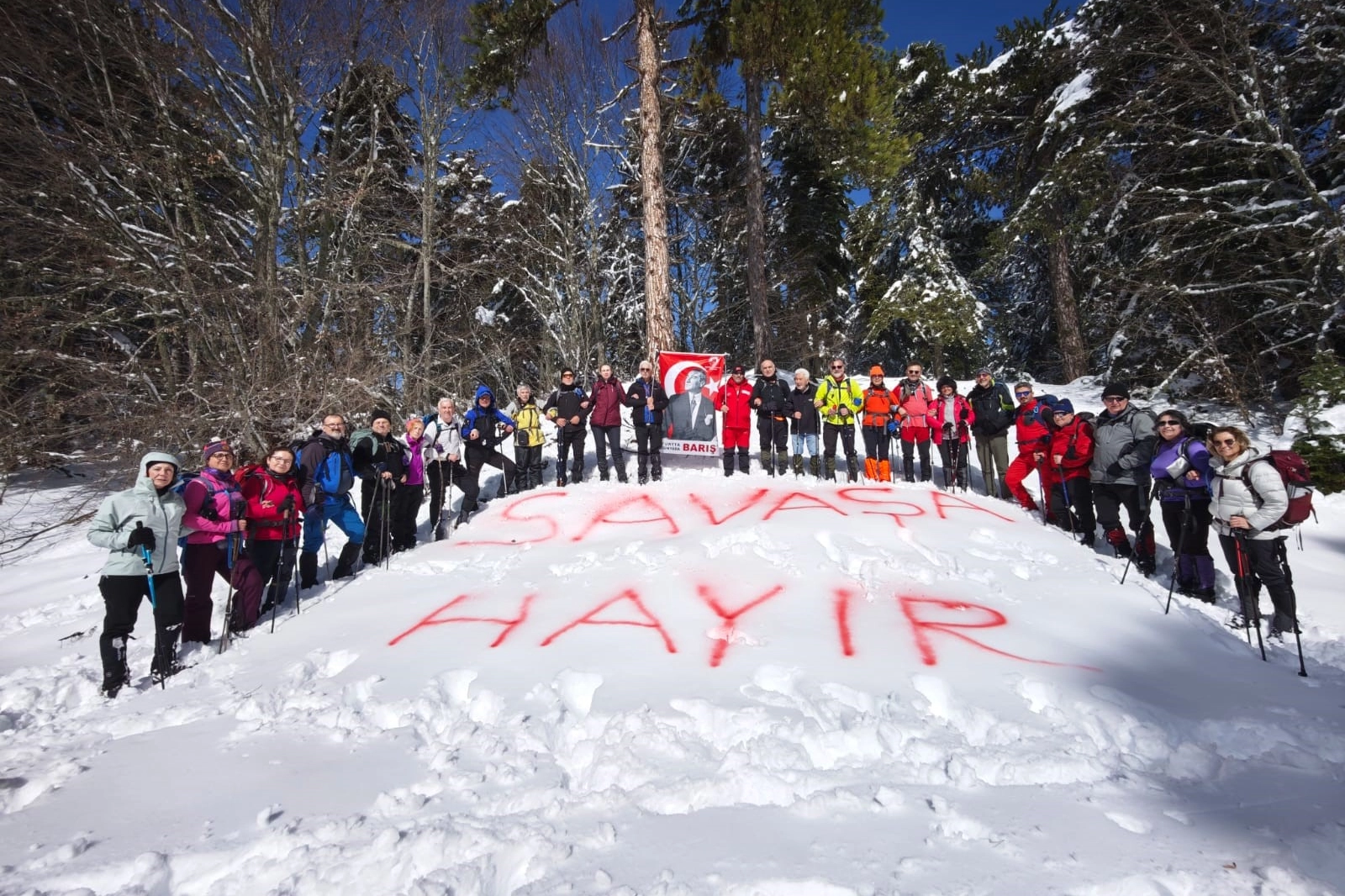 "Dağcılık sabrı, disiplini ve kardeşliği öğretir. Bizler zirveye ve doğada yürürken aynı zamanda toplumsal sorumluluğumuzu da hatırlıyoruz. Dağcıların toplumsal işleyişimizdeki önemi ve dayanışma duygusu var" dedi. Kulüp üyeleri ve katılımcılar, dünyada yaşanan savaş ve çatışmalara dikkat çekmek amacıyla anlamlı bir mesaj verdi. Beyaz kar örtüsü üzerine büyük harflerle 'Savaşa hayır' yazan doğaseverler, sporun barışçıl ve birleştirici gücünü bir kez daha ortaya koydu.