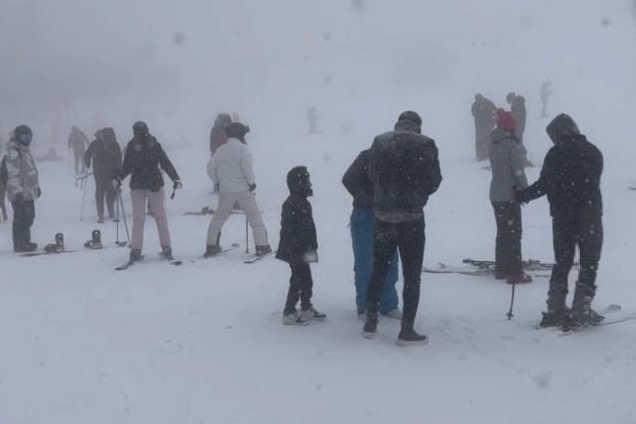 Yerli ve yabancı turistlerin akın ettiği kayak pistinde vatandaşlar sisli havaya rağmen kar yağışının tadını doyasıya yaşıyor.