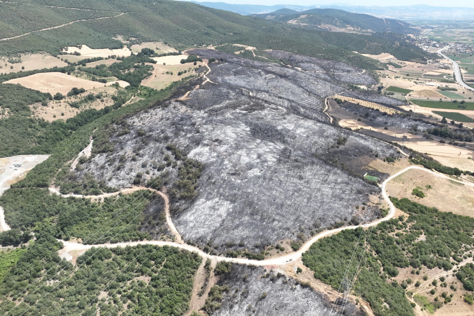 Yaklaşık 500 futbol sahası büyüklüğündeki yeşil alan yangından sonra simsiyah görüntüsüyle dikkat çekti. Orman ekiplerinin yangının üzerinden 20 saat geçmesine rağmen bölgede halen çalışmaların devam ettirdikleri görüldü.