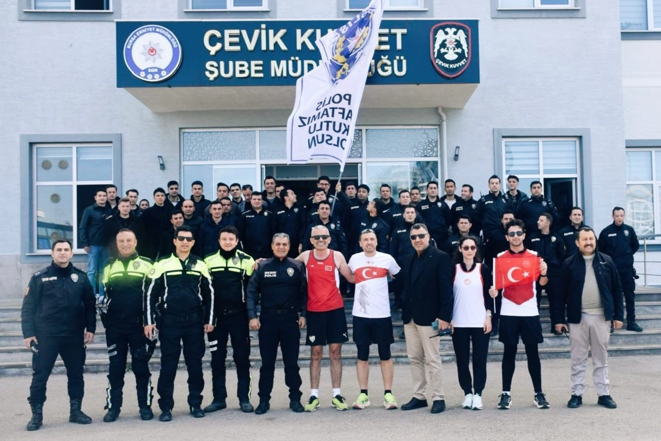 Türk Emniyet Teşkilatı'nın 180. yıldönümü sebebiyle Bursalı Yasin Avcı, Gülbeyaz Özdemir, Metin Bozkurt ve Emin Sonlu, açtıkları 'Polis Haftanız kutlu olsun' pankartıyla Kent Meydanı'ndan koşmaya başladı.