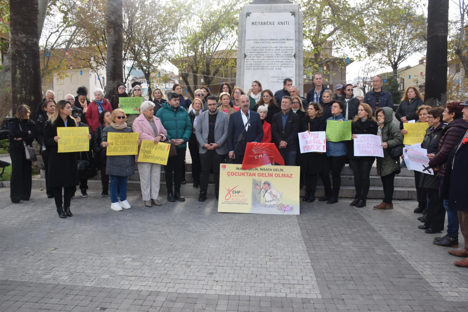 Cumhuriyet Halk Partisi Mudanya Kadın Kolları Başkanlığı'nın, 20 Kasım Dünya Çocuk Hakları Günü dolayısıyla Mütareke Meydanı'nda gerçekleştirdiği basın açıklamasına CHP Bursa İl Sekreteri Oktay Kartalkaya, Parti Meclisi Üyesi ve Bursa Milletvekili Orhan Sarıbal, Mudanya Belediye Başkanı Hayri Türkyılmaz, İl Yönetim Kurulu Üyeleri, İl-ilçe Kadın Kolları Başkanları, üyeleri ve partililer katıldı.