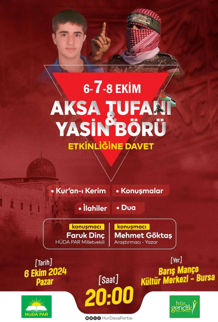Etkinlikte, Diyarbakır'da 10 yıl önce Kurban Bayramı'nda ihtiyaç sahiplerine et dağıtırken terör örgütü PKK yanlılarınca vahşice katledilen Yasin Börü ile Hamas'ın işgalci İsrail devletine karşı başlattığı Aksa Tufanı konuşulacak.