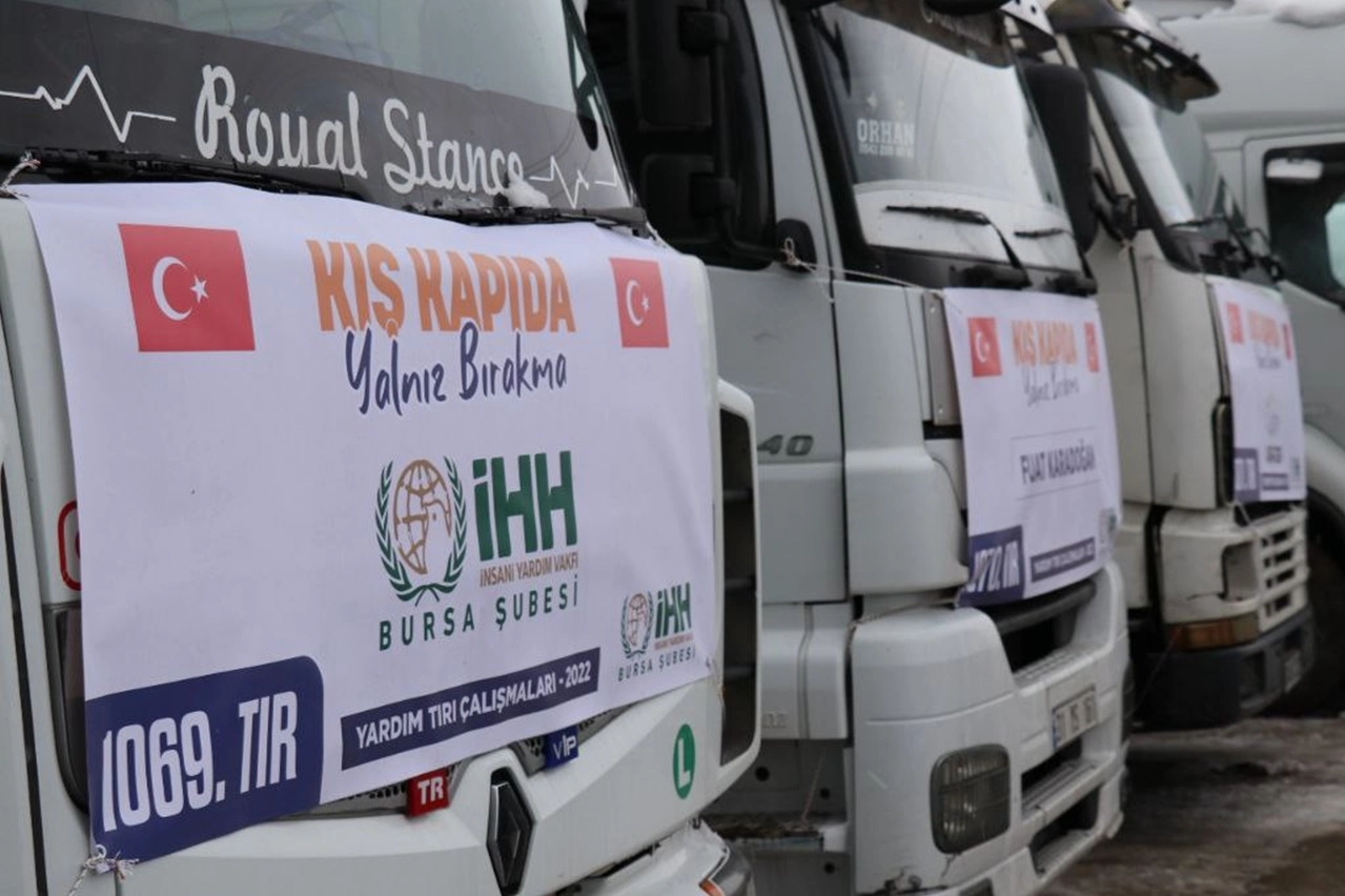Un, gıda, giyim, ilaç ve yakacak gibi malzemeleri taşıyan tırlar, ihtiyaç sahiplerine ulaştırılmak üzere İHH Bursa Afet Koordinasyon Merkezi'nde gerçekleştirilen törenle yola çıktı.