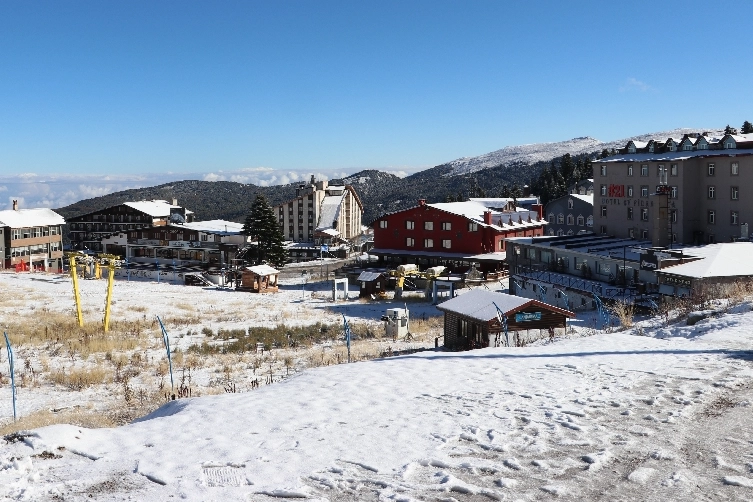 Uludağ'da gece saatlerinde başlayan kar, çok sayıda işletmenin yer aldığı Oteller Bölgesi'ni beyaza bürüdü.