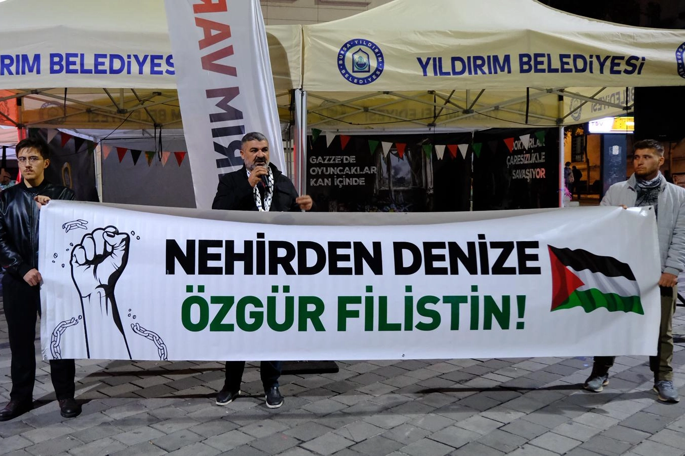 İnsan Hak ve Hürriyetleri (İHH) İnsani Yardım Vakfı Bursa Şubesi'nin organizasyonunda 15 Temmuz Demokrasi Meydanı'nda toplanan çok sayıda kişi, İsrail aleyhine slogan atarak, filoya yapılan saldırılara tepkisini ortaya koydu.