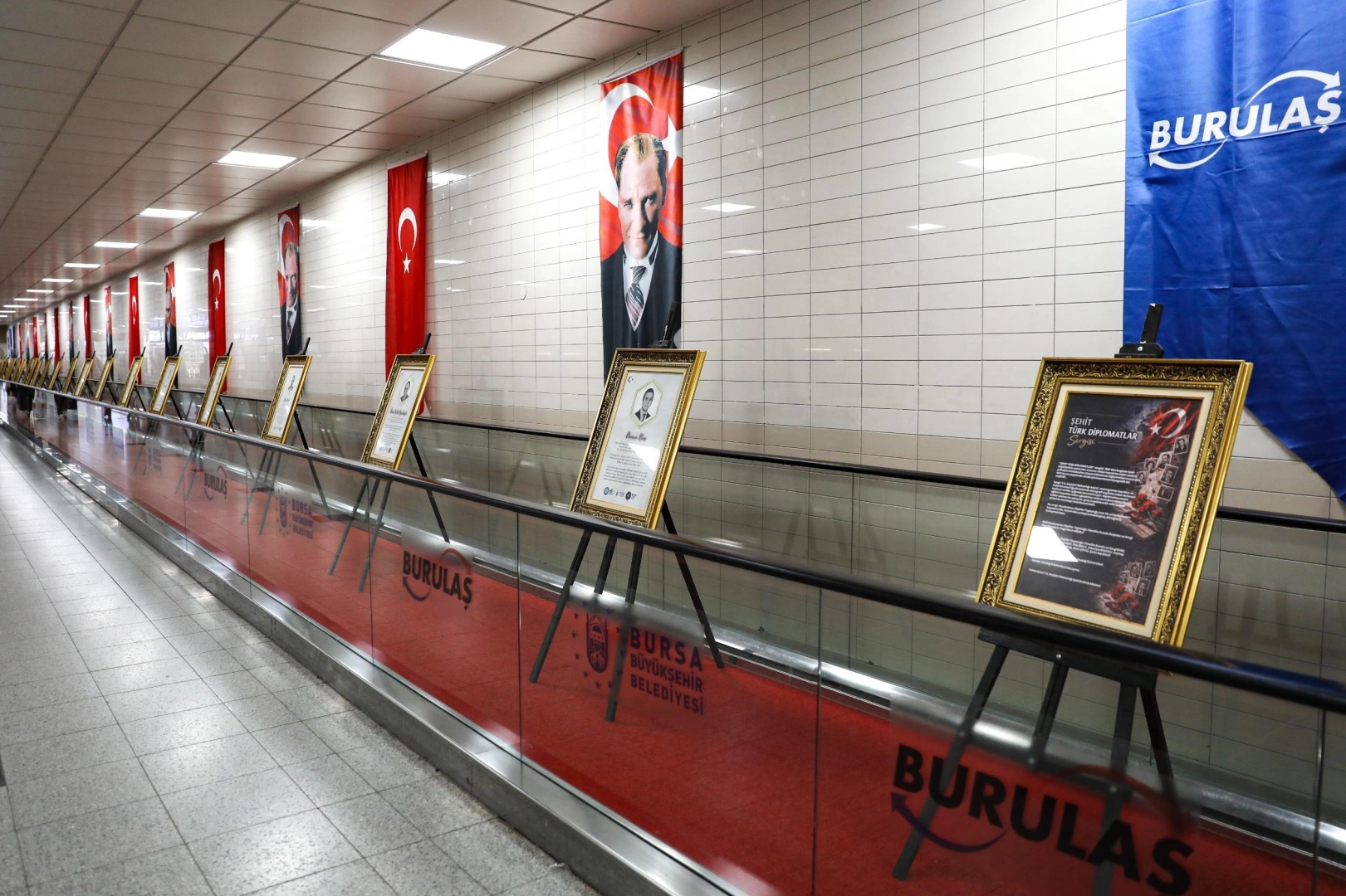 Uludağ Üniversitesi Metro İstasyonu’nda açılan ‘Şehit Türk Diplomatlar Sergisi’nde, 1980’li yıllardan itibaren terör örgütlerinin hain saldırılarına hedef olan Türk diplomatlarının aziz hatırası anlatıldı.