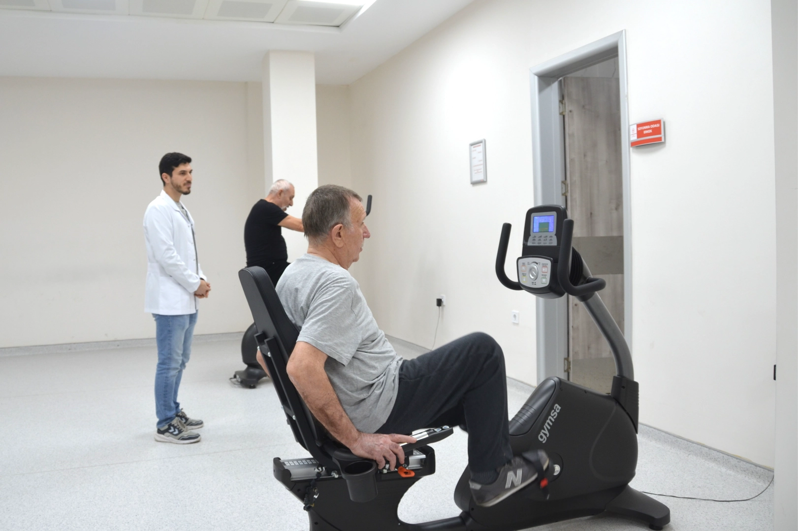 Tıp Fakültesinde aldığı eğitimle solunum hastalarına merkez bünyesinde pulmoner rehabilitasyon eğitimi vermeye başlayan Fizyoterapist Ahmet Gökburu ise, "Beraber yürüyüş bandında aerobik egzersizi, bisikletimizde ise yine aynı şekilde aerobik kapasitemizi arttırmak amacıyla çalışıyoruz. Daha sonrasında kas kuvvetini amacıyla dambıllarla çalışıyoruz. Burada amacımız hastaların akciğer oksijen kapasitesini arttırmak, egzersiz yapabilme kapasitesini arttırmak ve günlük yaşam aktivitelerini kendilerini daha rahat hissederek yapmalarını sağlamaktır. Bu şekilde onların yaşamına küçük bir dokunuş yapmış oluyoruz. Onların egzersizlerini düzenli bir şekilde devam ettirmelerini sağlıyoruz" şeklinde konuştu.