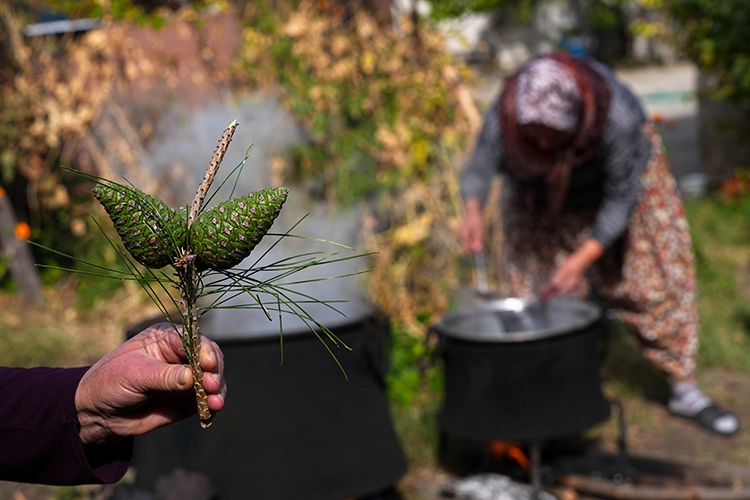 Ekipman almak için ORKÖY projesi kapsamında yüzde 20'si hibe geri kalanı ise faizsiz ödemeli 1 milyon 610 bin lira destek verilen kadınlar, eşlerinin ormandan topladığı kozalakları kazanlarda kaynatıp özüyle pekmez yapıyor.
