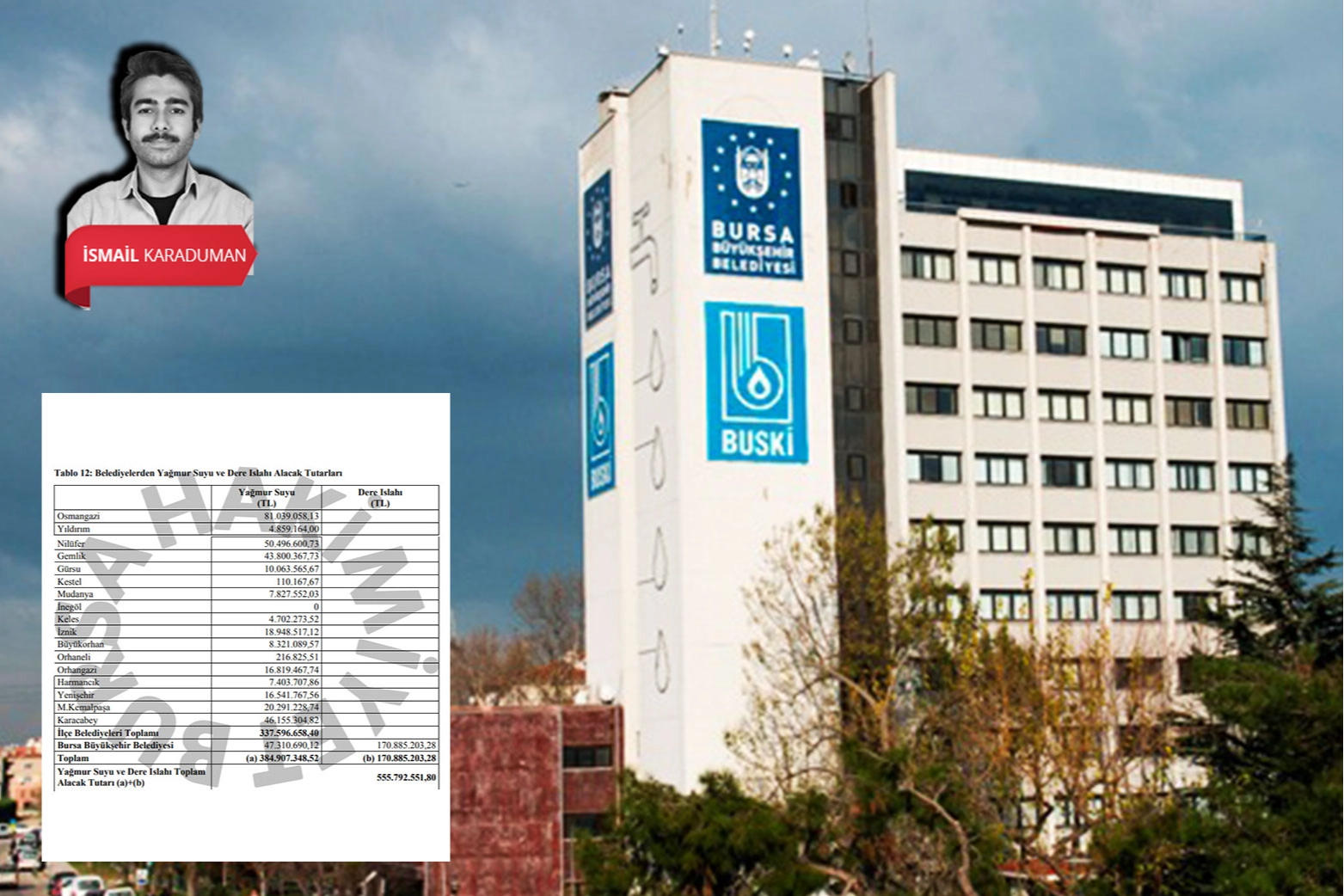 Yağmur suyu işleri hakkındaki 384 milyon 907 bin 348 TL 52 kuruşluk borcun 337 milyon 596 bin 585 TL 40 kuruşu ilçe belediyelerine, 47 milyon 310 bin 690 TL 12 kuruşu ise Bursa Büyükşehir Belediyesine ait.