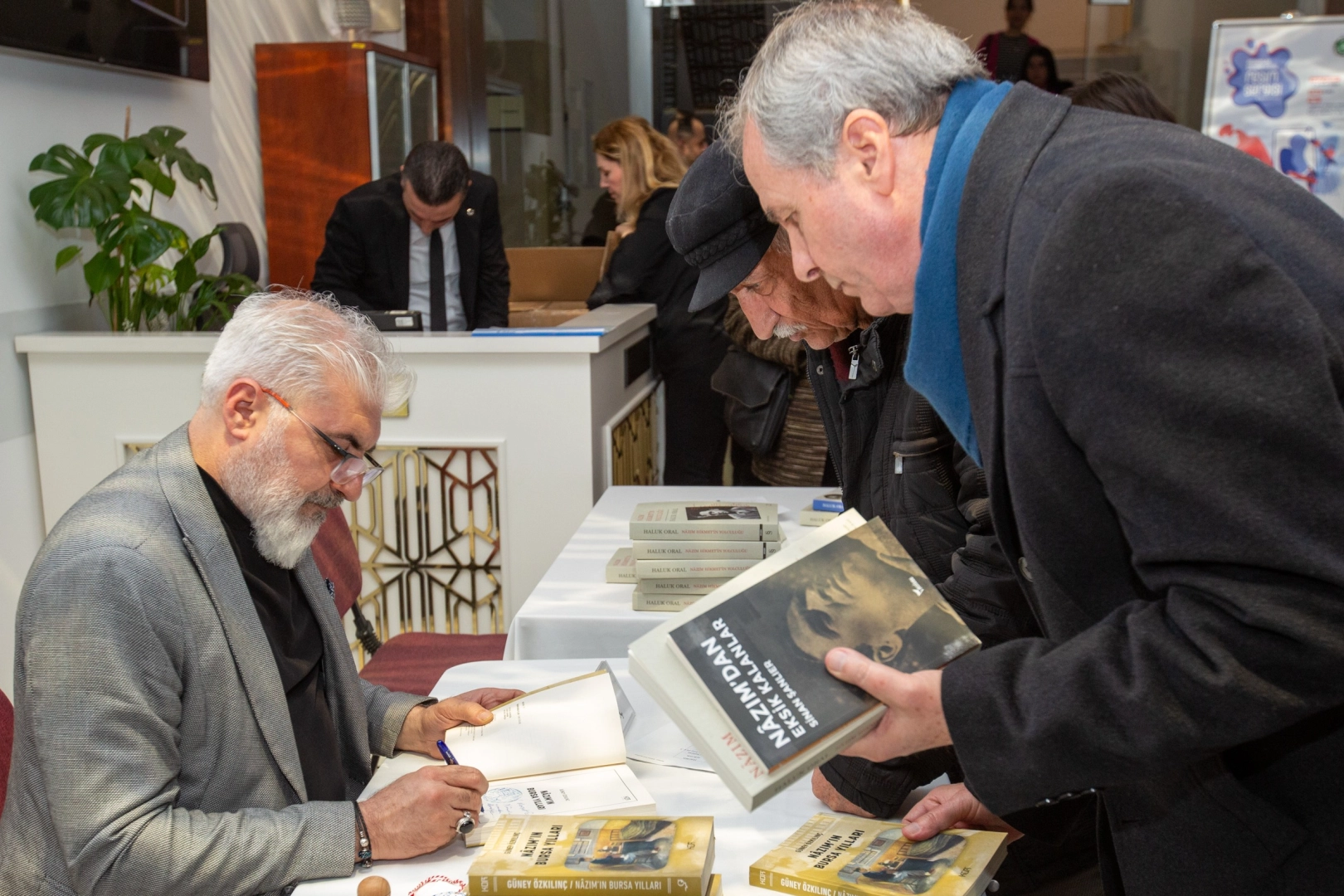 Söyleşinin ardından Prof. Dr. Haluk Oral, Sinan Şanlıer ve Güney Özkılınç, katılımcılar için kitaplarını imzaladı.
