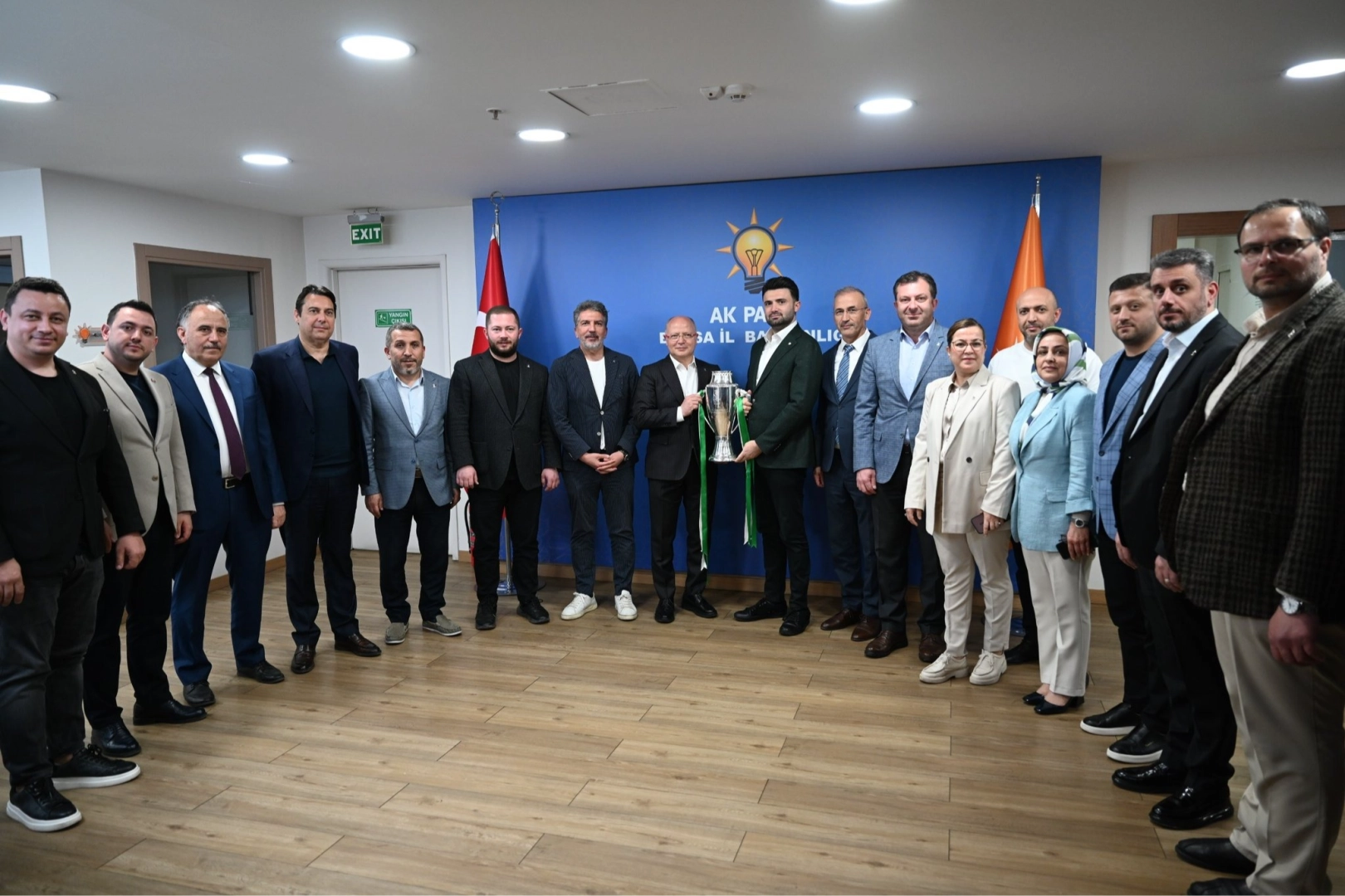 Bursaspor Başkanı Enes Çelik ve yönetim kurulu üyeleri, şampiyonluk kupasıyla beraber AK Parti İl Başkanı Davut Gürkan ve parti temsilcileriyle bir araya geldi.