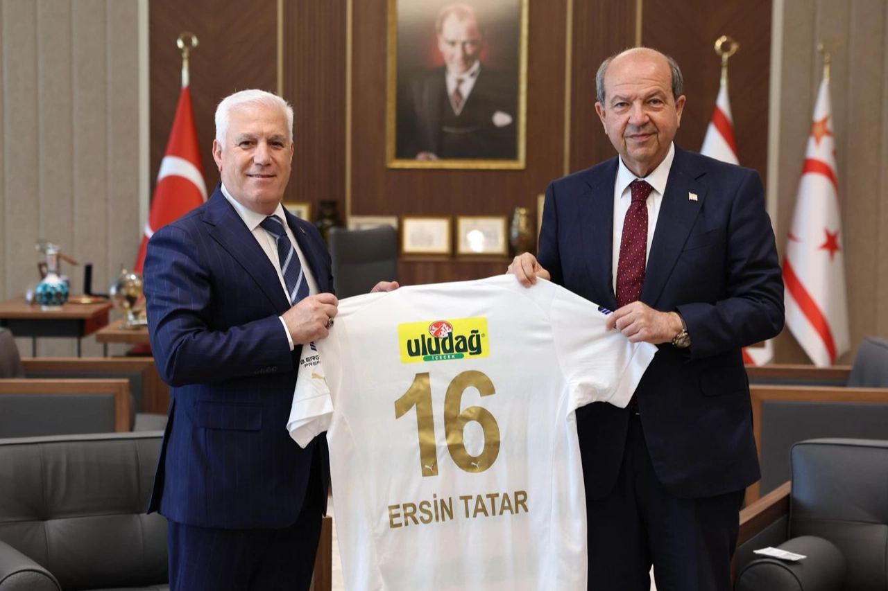 Bursa Büyükşehir Belediye Başkanı Mustafa Bozbey, Kuzey Kıbrıs Türk Cumhuriyeti’ne yaptığı ziyarette KKTC Cumhurbaşkanı Ersin Tatar’a Bursaspor forması hediye etti. İsmi yazılı 16 numaralı formayla poz veren Tatar, Bursaspor’a başarılar diledi.