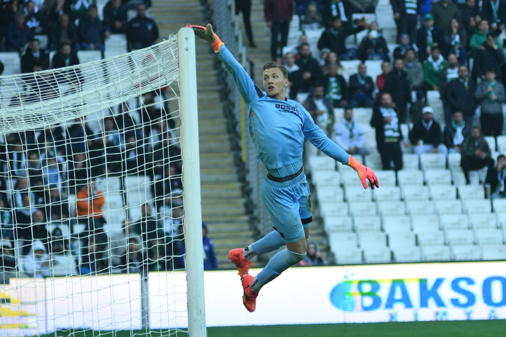 Bursaspor’un genç kalecisi Kerem Matışlı topu köşeden çıkarttı.