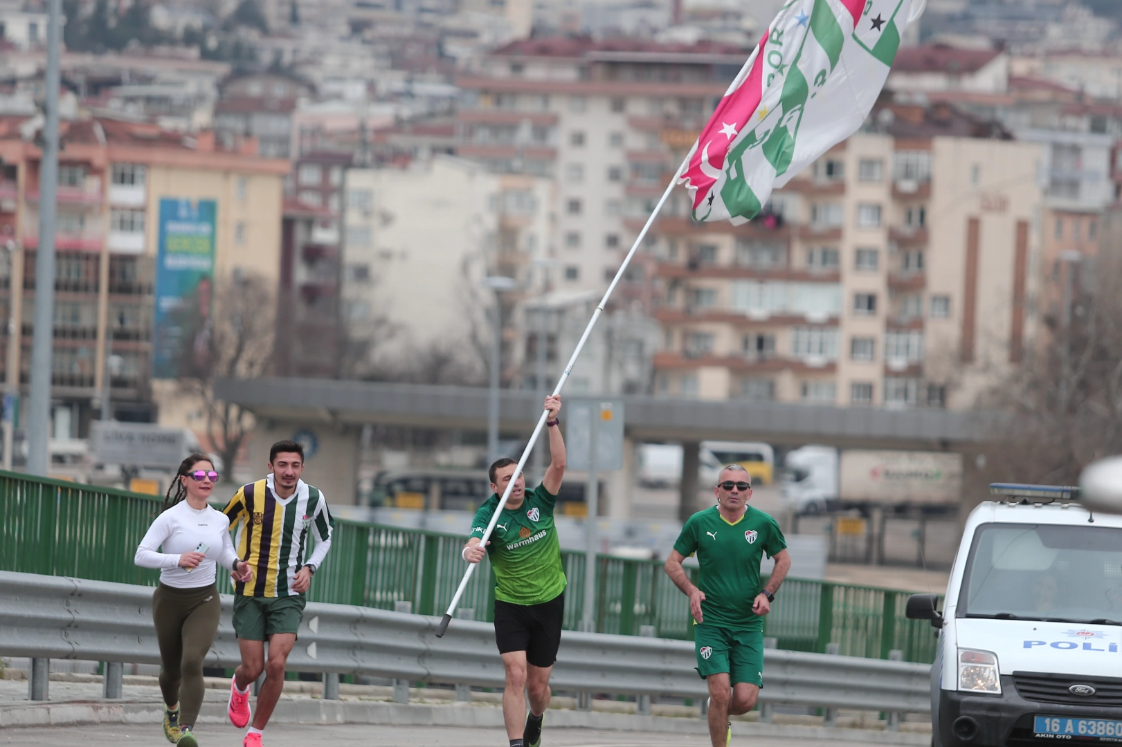 3 metrelik Bursaspor bayrağı ile koşan Yasin Avcı ve 3 arkadaşına motosikletli polis eşlik etti. Ana yolun sağ tarafından koşan Avcı ile arkadaşlarına sürücüler el sallayarak ve korna çalarak destek verdi.