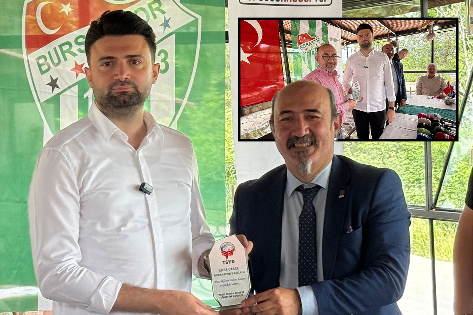 Türkiye Spor Yazarları Derneği Bursa Şubesi Başkanı Mehmet Ali Ekmekçi ve yönetimi, Bursaspor Başkanı Enes Çelik’e plaket taktim etti.