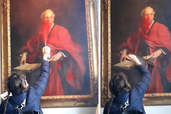 Cambridge Üniversitesi'ne bağlı Trinity College'ta sergilenen Lord Arthur James Balfour'un portresi tahrip edildi. Filistin yanlısı "Palestine Action" grubuna bağlı bir aktivist, önce tabloyu kırmızıya boyadı. Ardından maket bıçağıyla kesti.