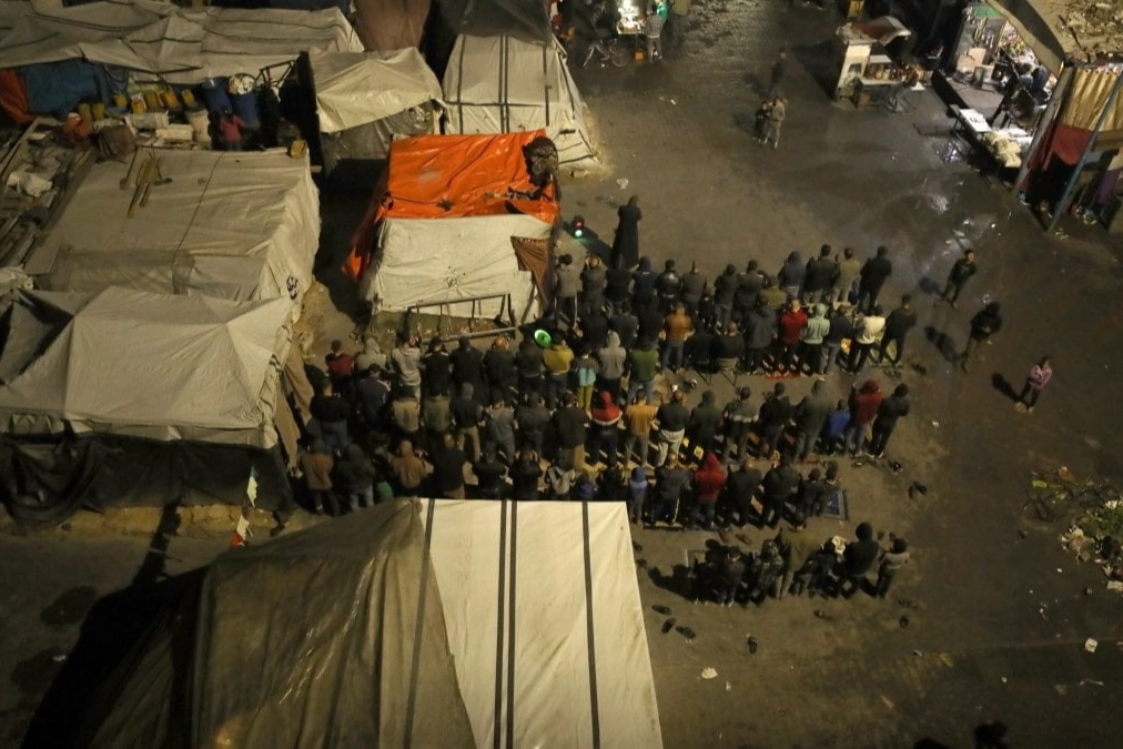 Daha önce İsrail saldırısında enkaza dönen Refah kentindeki Al-Farouq Cami’nin yanında cemaat oluşturan Gazzeliler, teravih namazını kıldı.