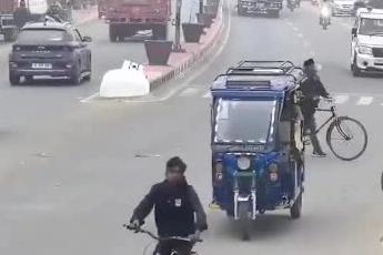 Hindistan'ın Uttar Pradesh eyaletine bağlı Rampur'da talaş yüklü bir kamyon, dönüş yapmaya çalışan otomobille çarpışmayı önlemek için ani manevra yaptı. Tekerleği orta refüje çarpan kamyon, dengesini kaybederek otomobilin üzerine devrildi. Olay yerine polis, itfaiye ve ambulans ekipleri sevk edildi. Kamyonu kaldırmak ve ezilen otomobildeki sürücüyü çıkarmak için vinç kullanıldı. Kağıt gibi ezilen otomobilin sürücüsü olay yerinde hayatını kaybetti.