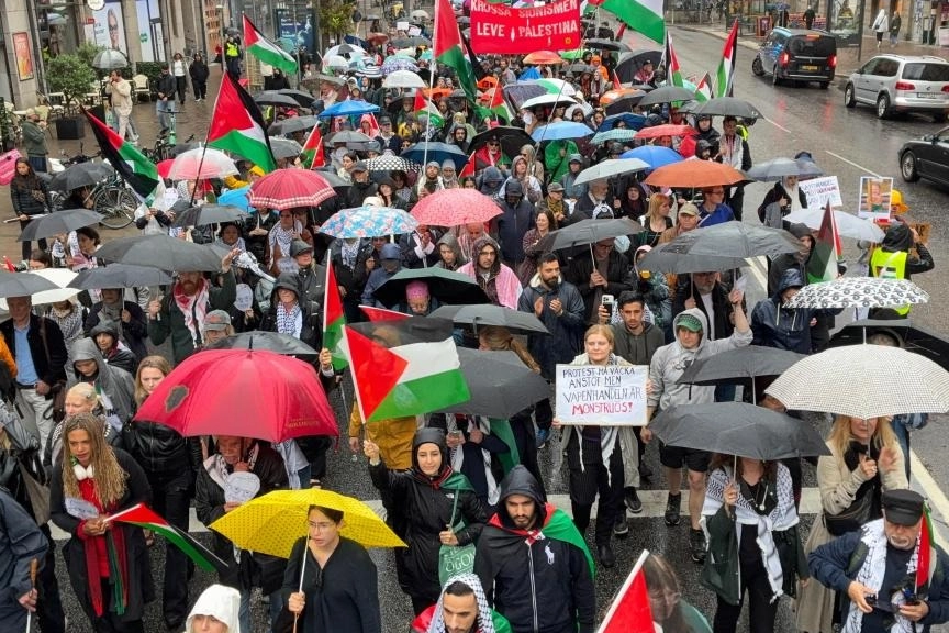 Çok sayıda sivil toplum kuruluşunun çağrısıyla Odenplan Meydanı’nda bir araya gelen yüzlerce kişi, İsrail'in Gazze'de işlediği savaş suçlarının derhal durdurulmasını talep etti.